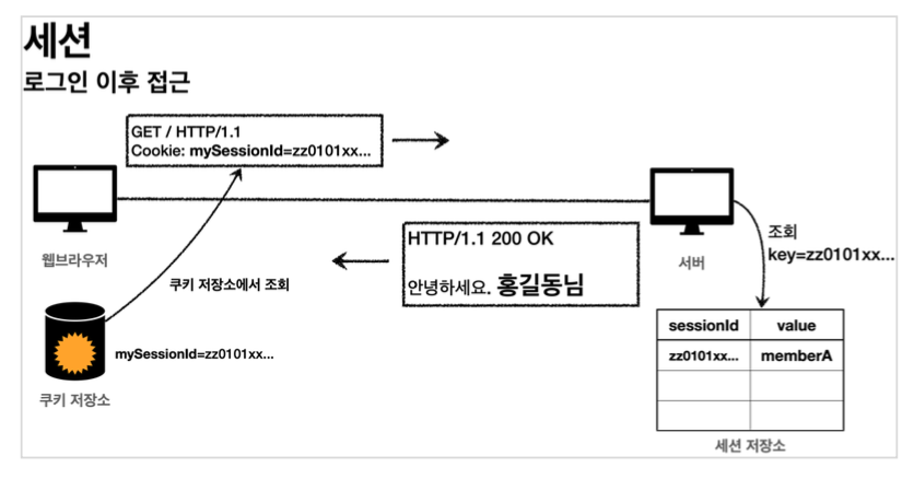 - 이 정보가 웹 브라우저에도 보관되고, 네트워크 요청마다 계속 클라이언트에서 서버로 전달된다.