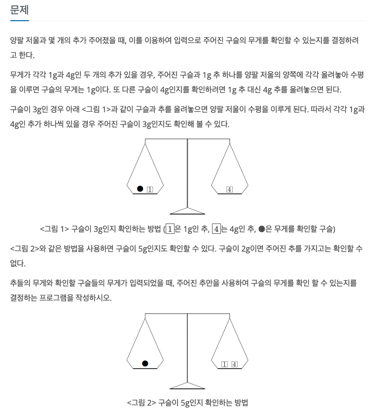 이 문제의 핵심은 가지고 있는 추를 이용해서 확인할 수 있는 추의 무게를 모두 찾아내서 원하는 추의 무게가 있는지 없는지 확인하면 된다. 다이나믹 프로그래밍으로 분류되어있는 문제이지만 수의 제한(추의 개수는 최대 30개)이 크지 않기 때문에 완전탐색으로도 해결할 수 있다.