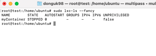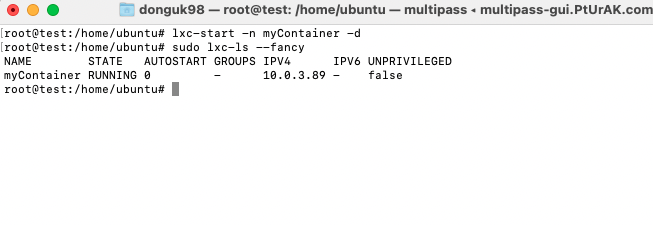 컨테이너의 상태가 RUNNING으로 바뀌었고, IP가 할당된 것을 알 수 있습니다.