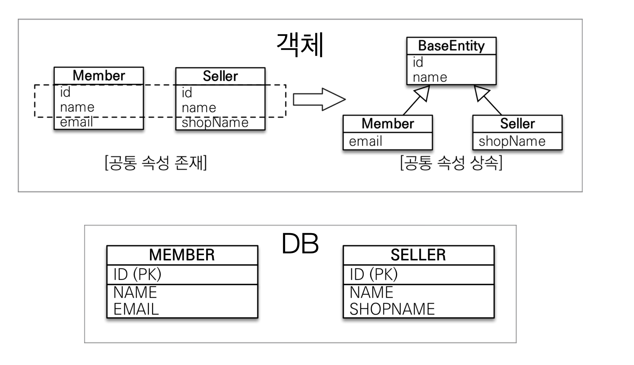 이 기법이 객체 상속과 유사한 기법이라고 할 수 있습니다. 즉, 공통된 데이터를 슈퍼타입에 남기고 객체가 가지고 있는 특별한 속성들만 서브타입에 남겨주는 구조를 가지고 있습니다.