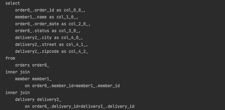아래 사진은 JPA에서 주문 DTO로 바로 조회하여 발생한 쿼리입니다. fetch join에 비해 훨씬 줄어든 select 절을 확인할 수 있습니다. Dto에 설정한 멤버 변수들만 select하여 가지고 온 것을 확인할 수 있습니다. 그러나 아쉬운 점은 repository 재사용성이 떨어진다는 것입니다.