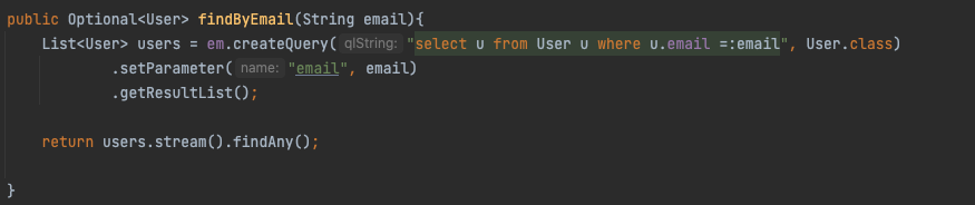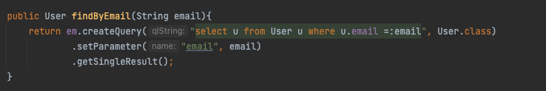 현재 작성된 findByEmail 반환타팁을 보면 User 객체이고 쿼리의 결과를 getSingleResult로 받아오고 있습니다. 여기서 javax.persistence.NoResultException이 발생하는데 NoResultException에 들어가보면 getSingleResult로 결과를 가져왔을 때 결과가 없는 경우에 무조건 예외를 발생시킨다는 것을 알 수 있었습니다.