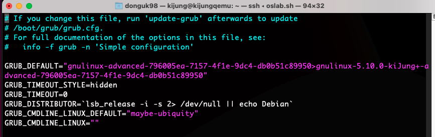 위 과정을 모두 마치고 난 이후, 부팅 시 기본 커널을 커스텀 커널로 설정해줘야 합니다. Femu 환경에서는 부팅 시 원하는 커널 버젼을 선택해 들어오기 때문에 따로 설정할 필요가 없지만, Qemu 환경에서는 반드시 설정해야합니다.