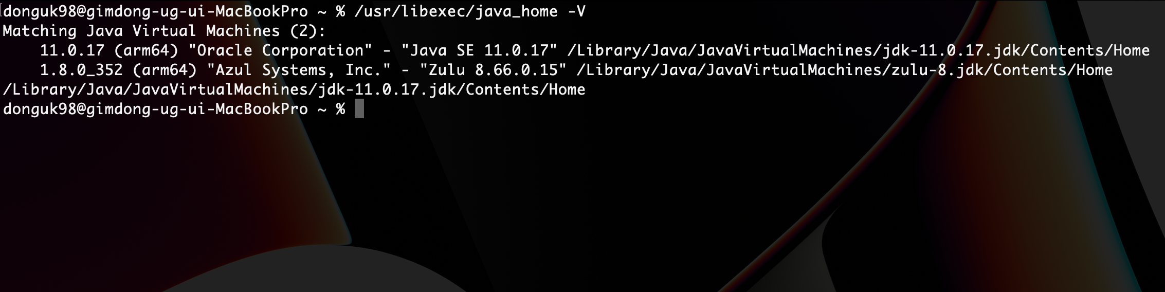 MAC OS를 기준으로, 현재 컴퓨터에 설치되어 있는 모든 자바 버젼을 보여주는 명령어입니다. 필요한 버전을 다운받는 방법은 쉽게 찾을 수 있으므로 생략하겠습니다. 해당 명령어를 입력시 아래와 같은 결과를 볼 수 있습니다.