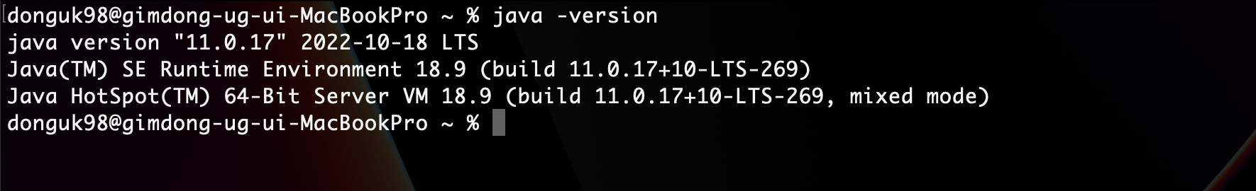 위에서 부터 자바 11, 자바 8 버전이 설치되어 있는 것을 알 수 있습니다. java -version을 입력하면 현재 시스템에 적용되고 있는 버전을 알 수 있습니다.