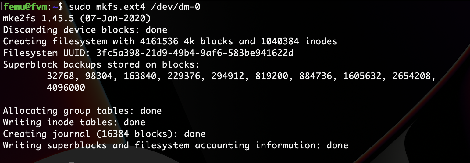 dm-zoned를 적용하고자 하는 파일 시스템으로 포맷팅합니다. 3번 과정까지 완료한 경우 디스크는 생성되었지만, 해당 디스크의 파일 시스템은 설정되지 않은 상태입니다. 그러므로 저는 ext4 파일 시스템으로 포맷팅 했습니다. 다른 여러가지 파일 시스템으로 포맷팅하는 방법은 조금만 찾아보면 쉽게 알 수 있습니다.
