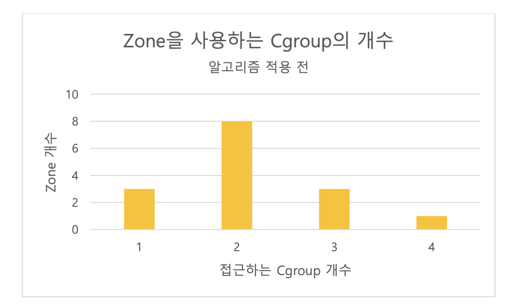 알고리즘 적용 전에는 여러 개의 cgroup이 하나의 zone에 접근하는 경우가 많았음을 알 수 있습니다. 적게는 2개부터 최대 4개의 cgroup이 하나의 zone에 접근하여 I/O 간섭이 발생합니다.