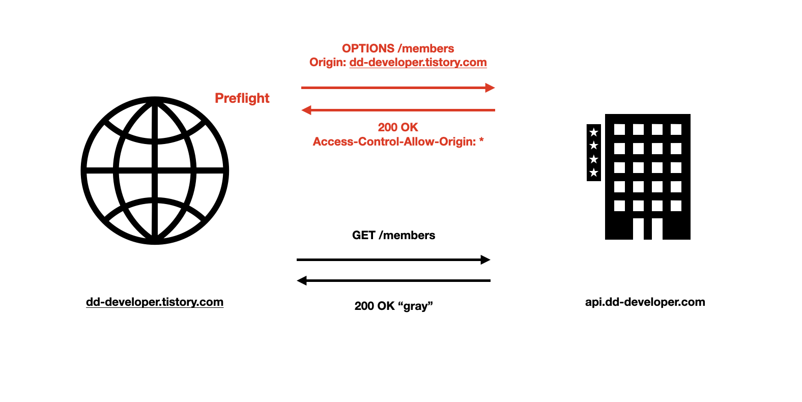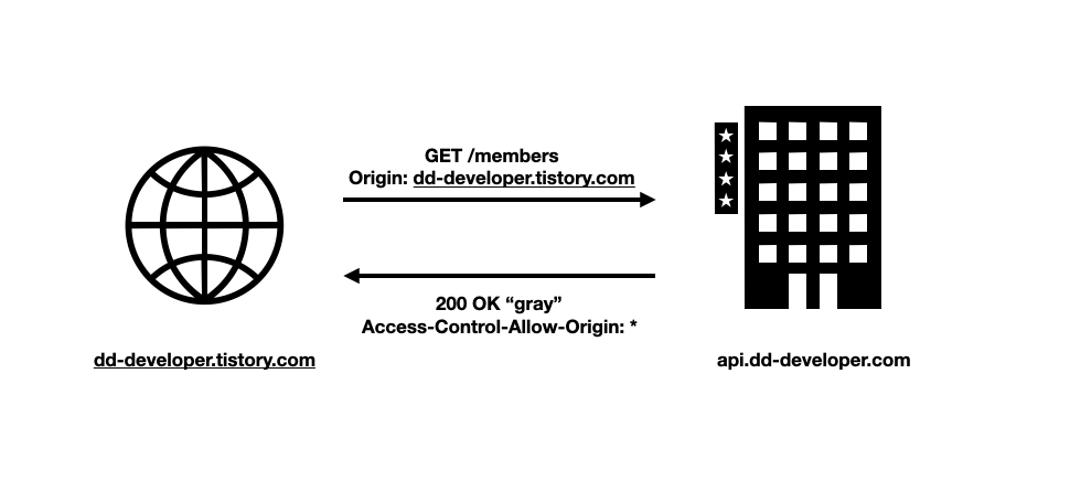 이후 서버가 요청에 대한 응답을 할 때 응답 헤더의 Access-Control-Allow-Origin이라는 값에 “https://dd-developer.tistory.com”를 설정합니다. 이후 응답을 받은 브라우저는 자신이 보냈던 요청의 Origin과 서버가 보내준 응답의 Access-Control-Allow-Origin을 비교한 후, 이 응답이 유효한 응답인지 아닌지를 결정합니다.