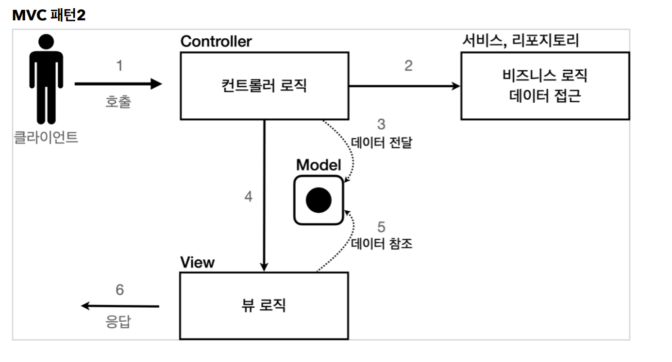 - 모델(M): 뷰에 출력할 데이터를 담아두는 역할. 뷰가 필요한 데이터를 모두 모델에 담아서 전달해주기 때문에, 뷰는 비즈니스 로직이나 데이터 접근을 몰라도 되고 화면을 렌더링하는 일에 집중할 수 있다.