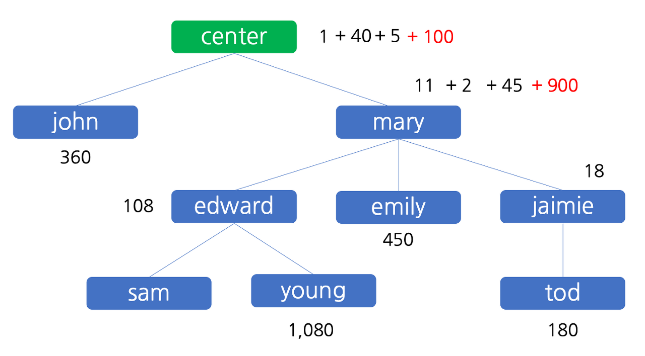 마지막으로, 판매원 mary 는 1,000 원의 이익을 달성하고, 이 중 10% 인 100 원을 센터에 배분한 후 그 나머지인 900 원을 자신이 가집니다. 이 상태를 그림으로 나타내면 아래와 같습니다.