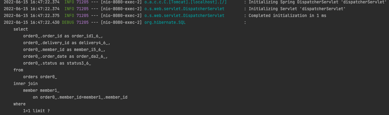 아래 사진은 JPA에서 주문 DTO로 바로 조회하여 발생한 쿼리입니다. fetch join에 비해 훨씬 줄어든 select 절을 확인할 수 있습니다. Dto에 설정한 멤버 변수들만 select하여 가지고 온 것을 확인할 수 있습니다. 그러나 아쉬운 점은 repository 재사용성이 떨어진다는 것입니다.