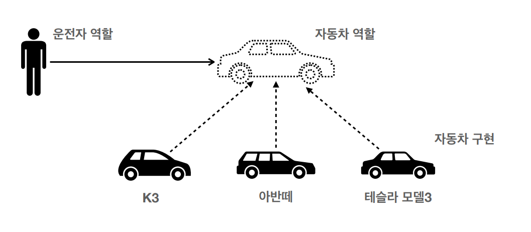 역할과 구현을 사물로 비유하기 위해 운전자-자동차 예시를 들어보자
